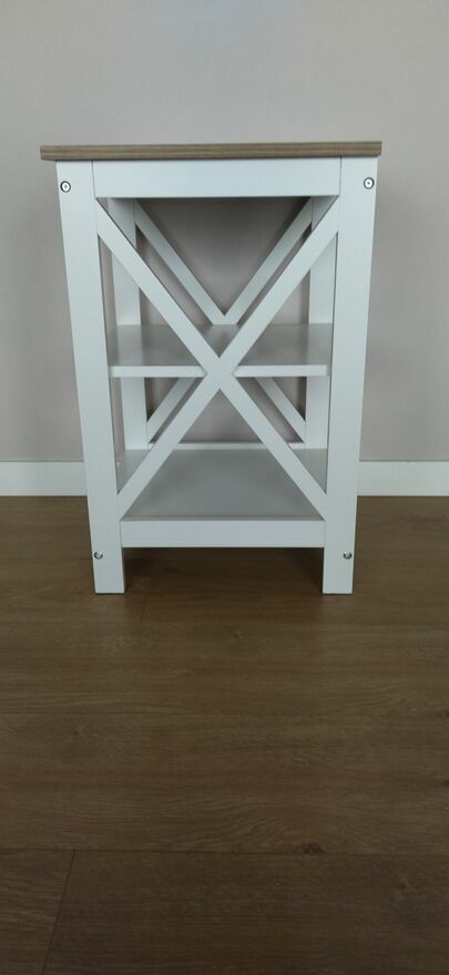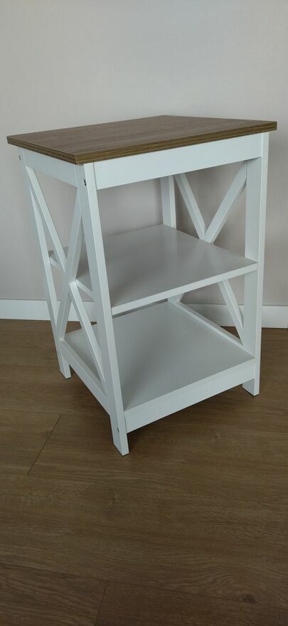Nowoczesny regał,stolik boczny w kolorze białym i brązowym. Mebel posiada dwie półki oraz podwójne detale krzyżowe po bokach. Jego prosty, nowoczesny design doskonale wpisuje się w różne aranżacje wnętrz. Stolik będzie praktycznym i eleganckim uzupełnieniem Twojego salonu lub sypialni. Wymiary 40x40x60.Sprawdź zainteresowanie tym ogłoszeniem