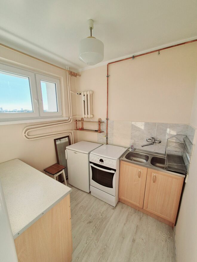 Znajduje się w wieżowcu na 6 piętrze. Wystawa okien wschód i południe. Jasna kuchnia.