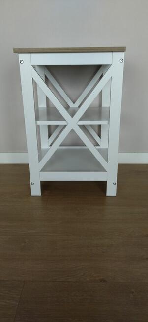 Nowoczesny regał,stolik boczny w kolorze białym i brązowym. Mebel posiada dwie półki oraz podwójne detale krzyżowe po ...