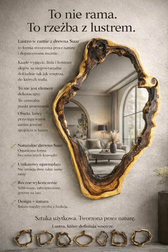 Stylowa, drewniana rama na lustro. Wykonana z naturalnego drewna Suar, które nadaje mu niepowtarzalny charakter. Rama jest unikatowym egzemplarzem, zaprojektowanym przez naturę. Ręcznie wykonane, z dbałością o szczegóły. Doskonale wpisuje się w nowoczesne i rustykalne wnętrza, dodając im elegancji i ciepła.Ramy z drewna Teak, surowe, wstępnie przeszlifowane wymagają końcowego szlifowania oraz wykończenia olejem lub lakierem. Ramki o grubości ok. 3 cm.
