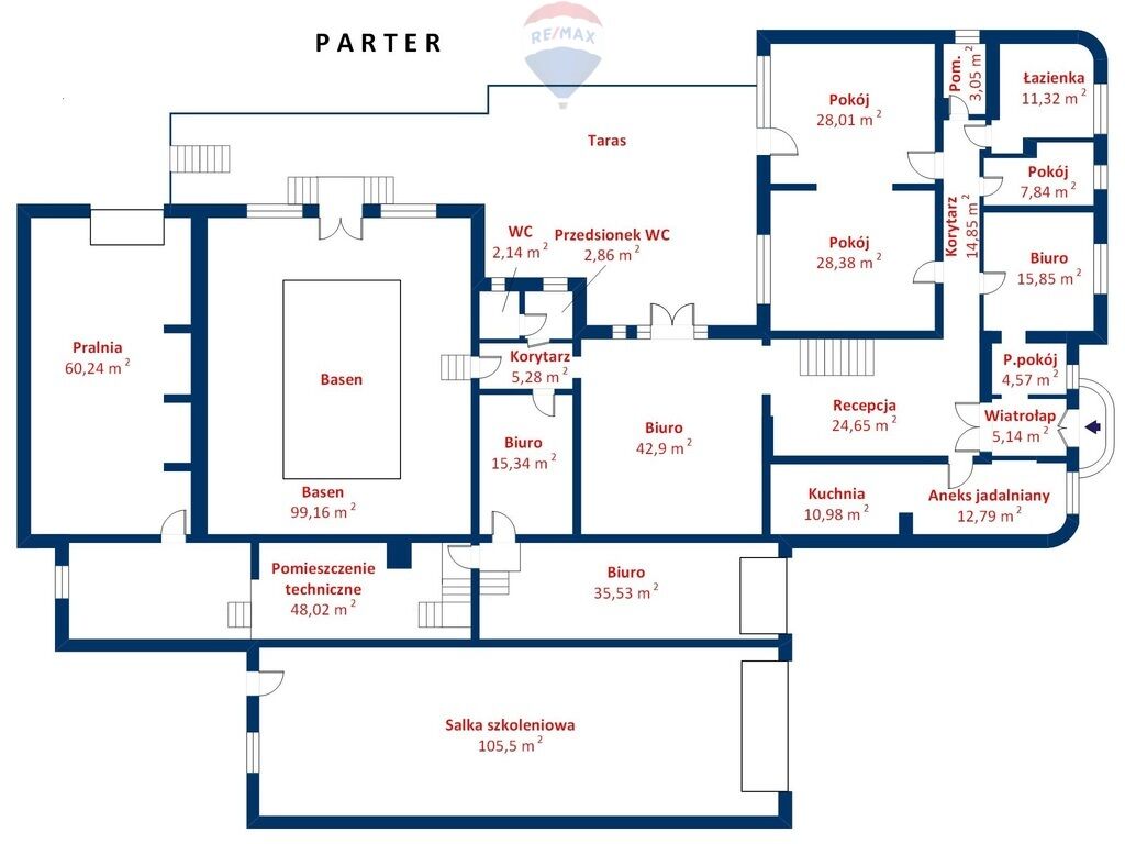 - Basen wewnętrzny 8,5 x 5 m (42,5 m² powierzchni lustra), 75 000 l