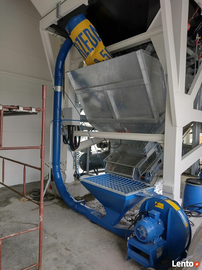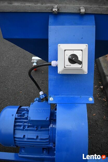 Dmuchawa z silnikiem 5,5 kW/400V. Obroty wirnika 2800 obr/min. (produkujemy także z silnikiem 1400 obr/min). Wyłącznik gwiazda/trójkąt. Dmuchawa o wysokiej sprawności. Maszyna zbudowana jest z segmentów łatwo wymienialnych które zawsze mamy na stanie. Produkujemy także ocynkowane trwałe sita nakładane na górę wsypu (rozstaw oczek 6×6 cm), które zapobiegają dostaniu się grubszych nieczystości do wsypu (takie jak części worka ....)