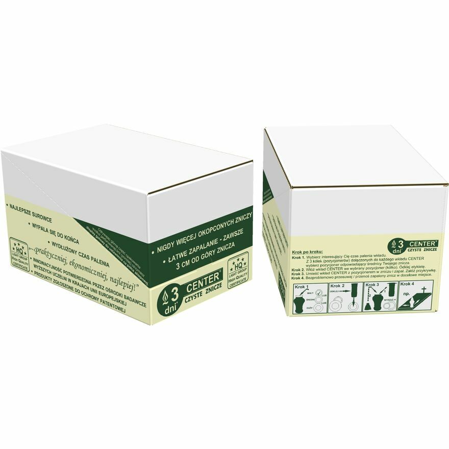 Z przodu i z boków wzdłuż linii rozgraniczającej kolor ciemnozielony i żółty, a dalej po kolorze białym linia perforowana służąca do oderwania góry pudła: