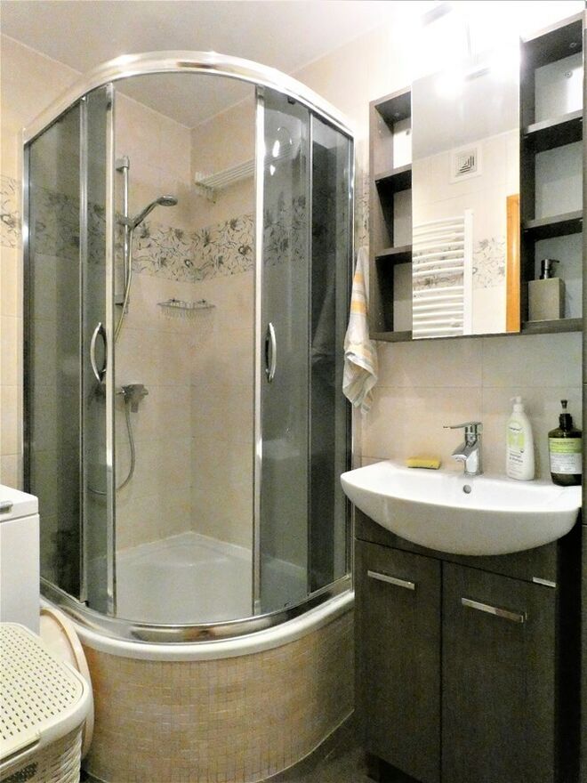 Łazienka: kabina prysznicowa, umywalka i pralka, szafki i kosz na