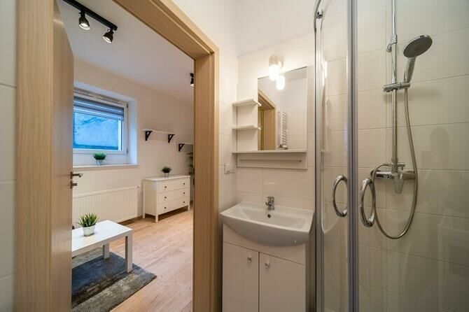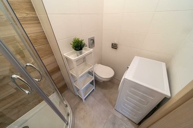 Łazienka: kabina prysznicowa, pralka, lustro z półką, regał, WC.