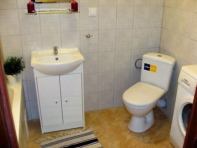 Łazienka: wanna, pralka, WC i umywalka.