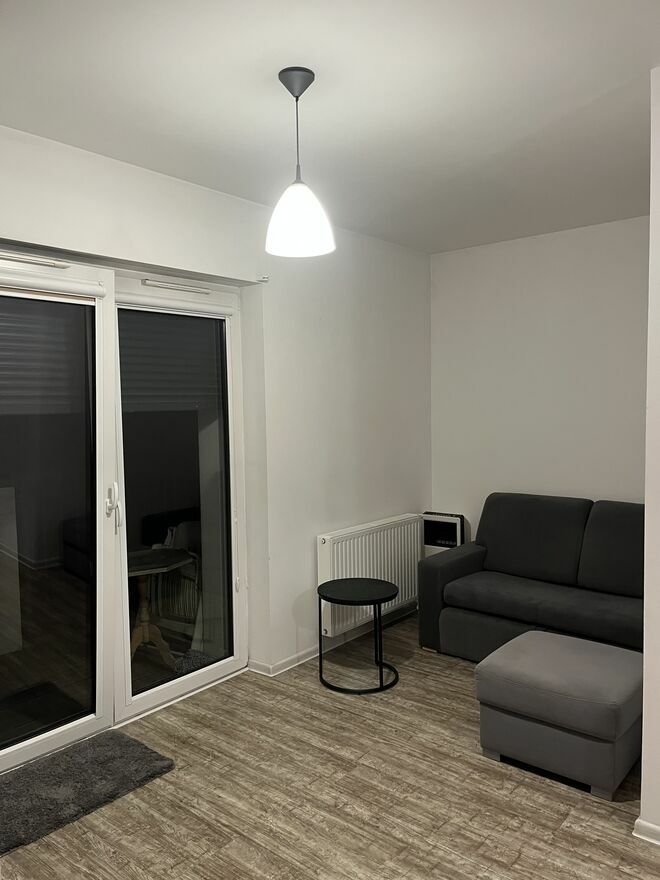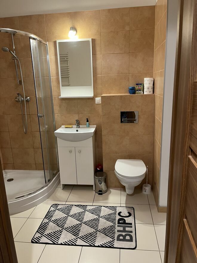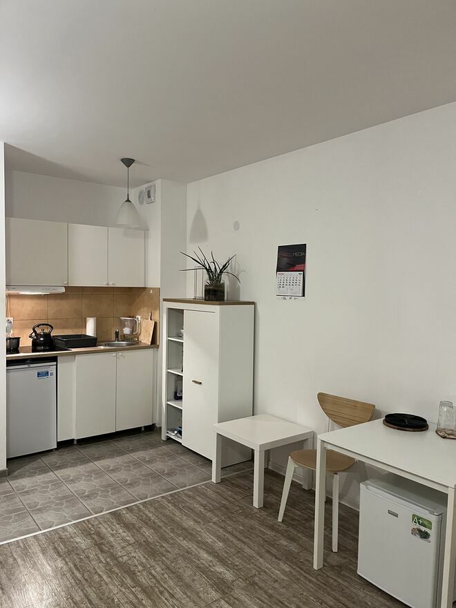 Duży pokój z aneksem kuchennym i przestronną łazienką. Na wyposażeniu: nowa płyta grzewcza, lodówka, zamrażarka, pralka, rozkładana kanapa, stół i krzesła, duża szafa z frontami lustrzanymi typu komandor, pufa,stolik kawowy i klimatyzator oraz niezbędne przybory kuchenne. Przestronny balkon, wykończony deską tarasową, z widokiem na część zieloną.