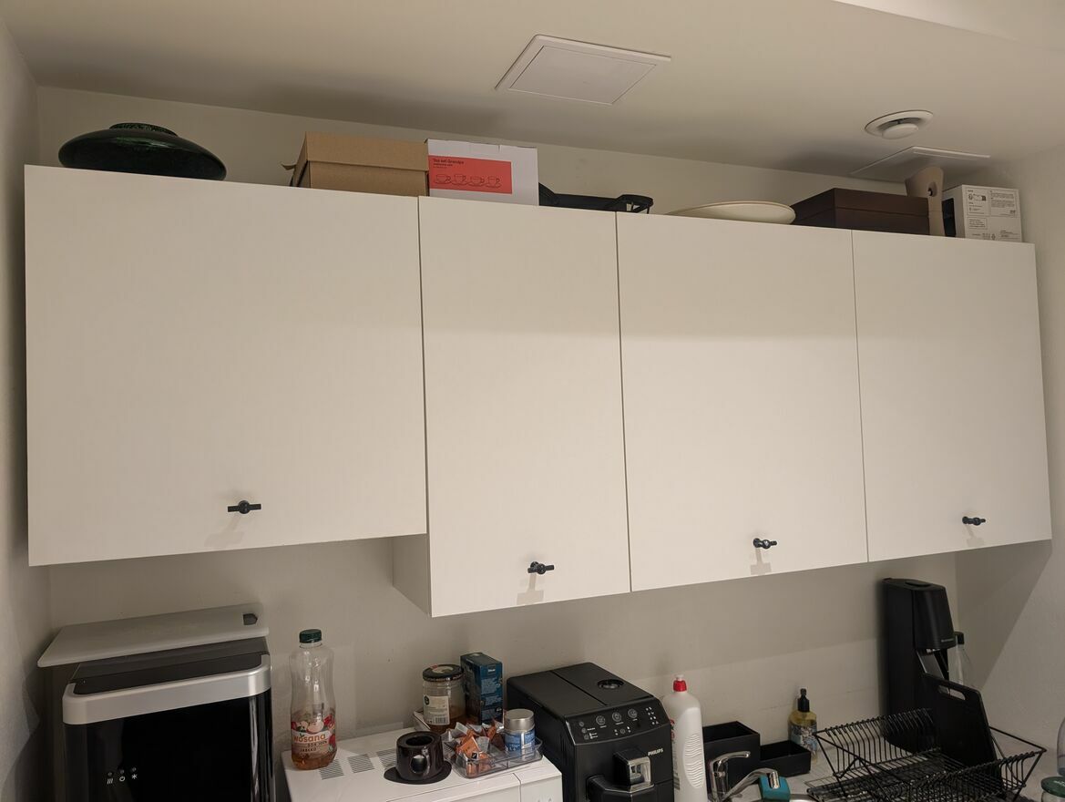 4. Meble kuchenne z seryjnej produkcji (wymiary standardowe), producent - korpusy - płyta wiórowa w kolorze białym, fronty - płyta wiórowa laminowana w kolorze białym, zawiasy i prowadnice szuflad standardowe (Lama). Zawartość zestawu. Szafki wiszące: szafka okapowa 60 cm, szafka 40 cm, szafka 60 cm (2 szt.). Szafki stojące: szafka zlewozmywakowa 60 cm, szafka z szufladą 60 cm, szafka 3 szuflady 40 cm, zlew kuchenny jednokomorowy stal nierdzewna, bateria kuchenna, blat kuchenny o długości około 230 - 240 cm;