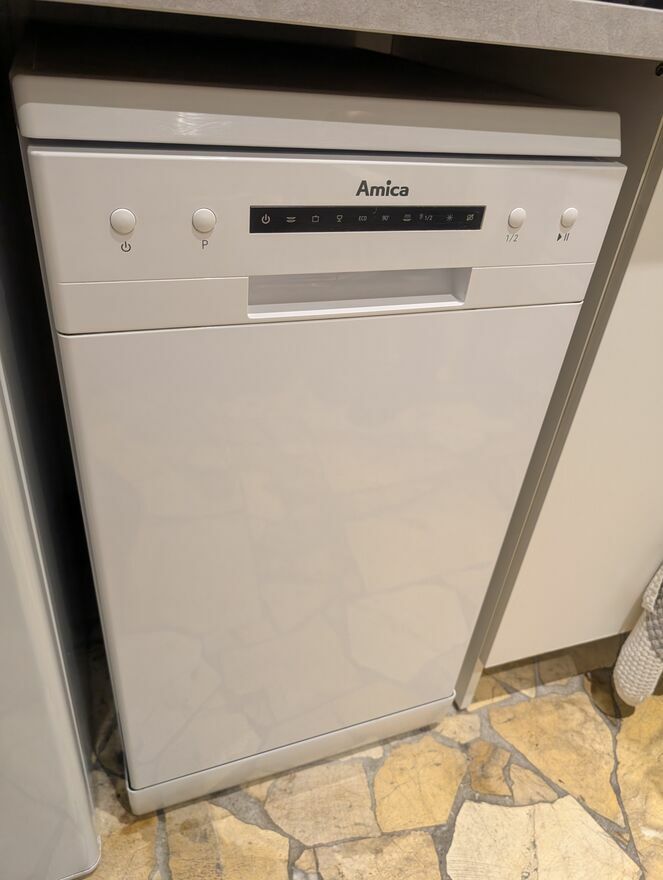 2. Zmywarka Amica wolnostojąca wąska, model DFM404WEN. Szerokość 44,8 cm, na 9 komp.;