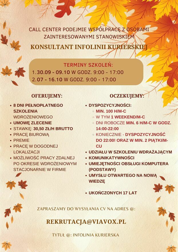 !!! DODATKOWO: KONIECZNIE DYSPOZYCYJNOŚĆ W DNIACH: 31.10 I 10.11 !!!