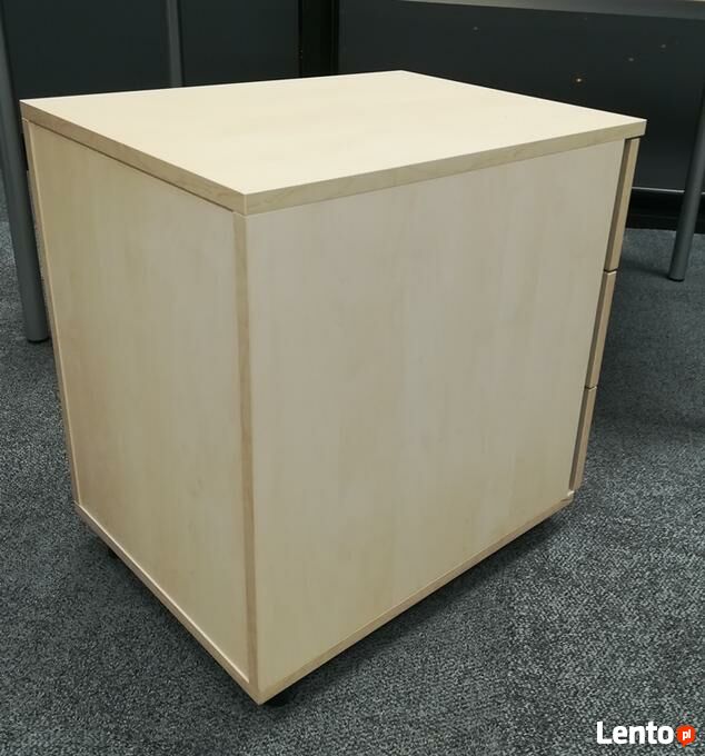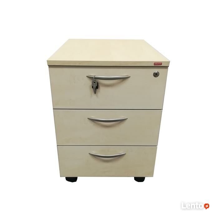 3 szuflady wysuwne na dokumenty, fronty szuflad melaminowe z metalowymi uchwytami.